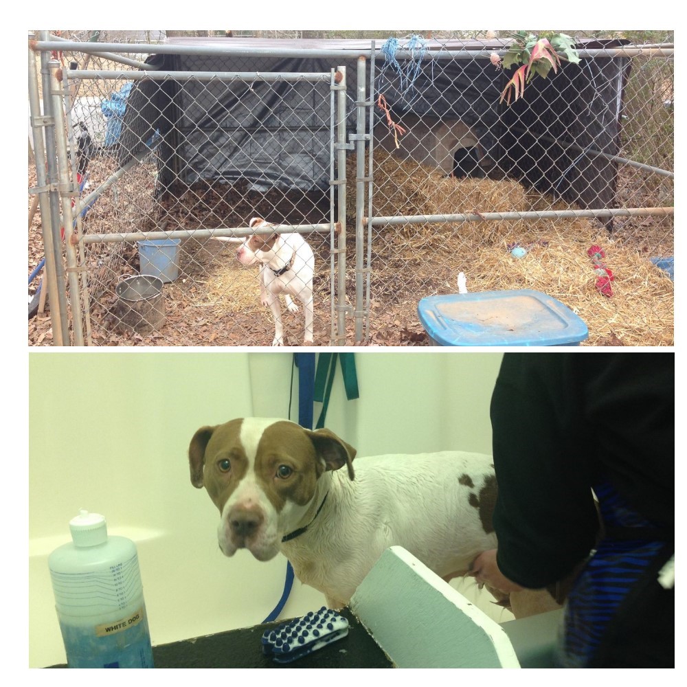 Rescue story: I first noticed Queen when I was driving around a neighborhood close to home looking for anyone who had lost a beautiful blue female Pit Bull I had seen running on North Marietta Parkway. As I was driving around, slowly stopping and asking those walking down the streets nearby if they knew where the dog belonged. I came across a yard that had an old beat up dog pen sitting on the side of the property very close to the road. Inside was a female white and brown Pit Bull - very skinny, super friendly and hungry as could be. I pulled over, and as I was talking to the dog through the pen, the owner came out of his house to see what I was doing. I explained I was trying to find the owner of the blue Pit Bull; he and I started discussing his dog inside the pen. He allowed me to go inside the pen and give treats to his dog Queen. She was so sweet and so hungry. I noticed that she had pups recently, she was dirty and smelly, her nails needed to be trimmed and didn't seem to be in the best of health. I took a chance and asked him if she had ever seen a vet, been spayed or had any shots - he said no. I then asked him if he would allow me to take her to the vet, get her spayed and current on her shots. He agreed. I also asked if I could help him with dog food for her, he declined saying she was fine and he could afford her dog food.