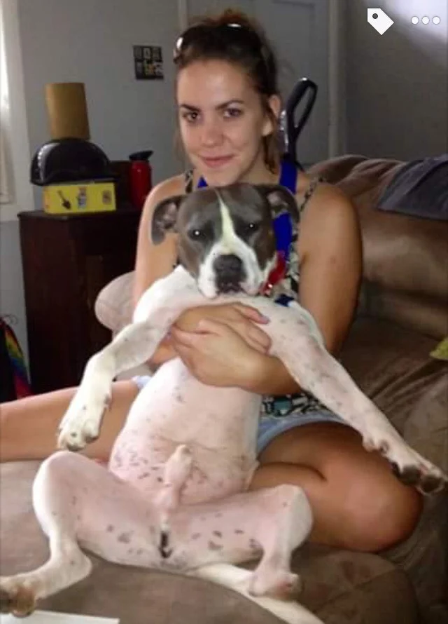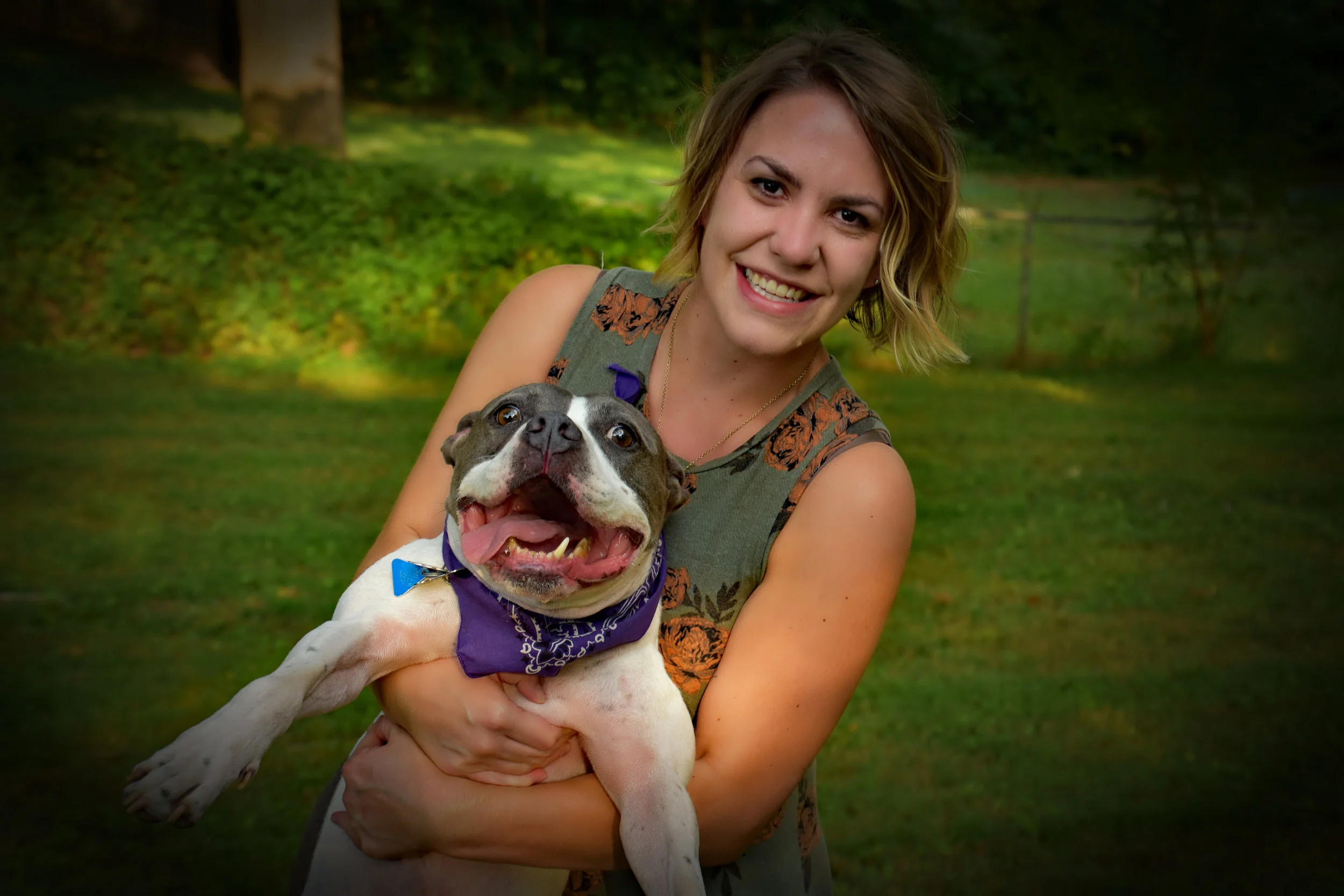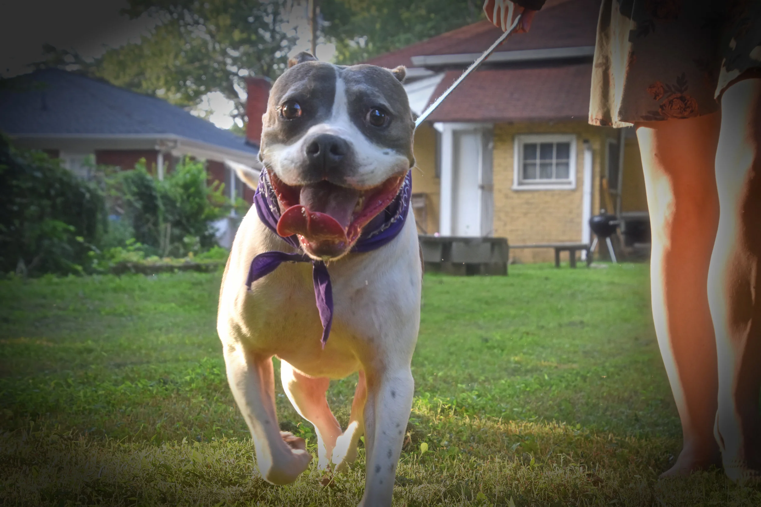 Rescue Story: I lived in Candler Park when I was in graduate school 5 years ago. I was walking in the neighborhood when I passed a home with dogs in the yard and immediately saw a white and grey pit bull in the front yard. I went up to the side of the fence and he just rolled over for belly-rubs immediately. I couldn’t even reach him through the fence but he was so excited that someone was stopping to say hello to him. I fell in love the second I saw his big head and silly demeanor that was so trusting of me.