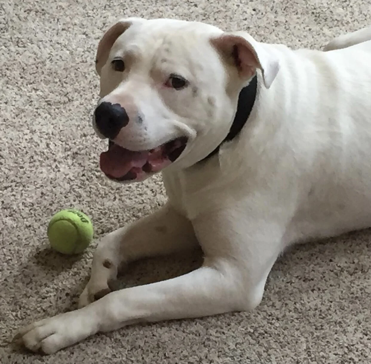 Rescue Story: We rescued Diesel from a previous co-worker of mine. She and her husband are in their 70’s and live in South Georgia. One day, during the wintertime, she went out to get her mail, and saw something white tied to her mail box. When she got closer, she realized it was a puppy and it was almost dead (malnourished and freezing). He had been abandoned. She carried him back to her house and nursed him back to health (unaware of how big he was going to get). When she realized how large he was (85lbs of muscle) and what breed he was, she called me. She knew I loved pit bulls and she told me she couldn’t lift him to get him to the vet or walk him and needed him to go to a new home where she knew he would be spoiled rotten.
